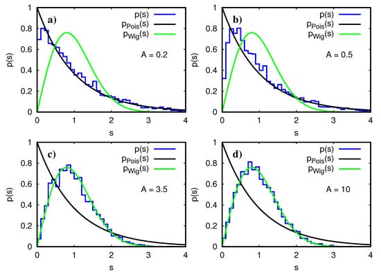 In Figure 4, we present the nearest level spacing distribution p ( s ) for different values of the Åberg parameter. To compute p ( s ) , we have used only the “physical” levels in the lower half of the energy spectrum and the unfolding has been done with the integrated density of states (9), where q ( E ) is replaced by a fit polynomial of degree 5. For the smallest value A = 0.2 , the distribution p ( s ) is very close to the Poisson distribution with some residual level repulsion at very small spacings. This is a quite well known effect because typically the transition from Wigner–Dyson to Poisson statistics (when tuning some suitable parameter such as the Åberg parameter from strong to weak coupling) is non-uniform in energy and happens first at larger spacings (energy differences) and then at smaller spacings. The reason is simply that two levels which by chance are initially very close are easily repelled by a small residual coupling matrix element (when slightly changing a disorder realization or similar). For A = 0.5 , there is somewhat more level repulsion at small spacings, but the distribution is still rather close to the Poisson distribution with some modest deviations for s 1.2 . For the larger Åberg values A = 3.5 and A = 10 , we clearly obtain Wigner–Dyson statistics (taking into account the quite limited number of only d / 2 1 = 5719 level spacing values for the histograms). These results clearly confirm that the transition from A < 1 to A > 1 corresponds indeed to a transition from a perturbative regime to a regime of chaotic mixing with Wigner–Dyson level statistics [14].