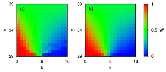 Figure 6. Color density plot of the orbital occupation number n k in the plane of energy E and orbital index k. (a) n k values of exact eigenstates of H with Åberg parameter A = 3.5 ; (b) thermalized Fermi–Dirac occupation number n ( ε k ) , where β and μ are determined from (12) as a function of total energy E. The occupation number n k is averaged over all eigenstates (a) or several representative values of E (b) inside a given energy cell. The energy interval 29 E 39 corresponds roughly to the lower half of the spectrum (at M = 16 , L = 7 ) for states with positive temperature and is similar to the energy interval used in Figure 4 and Figure 5. The color bar provides the translation between n k values and colors (red for maximum n k = 1 , green for n k = 0.5 and blue for minimum n k = 0 ).