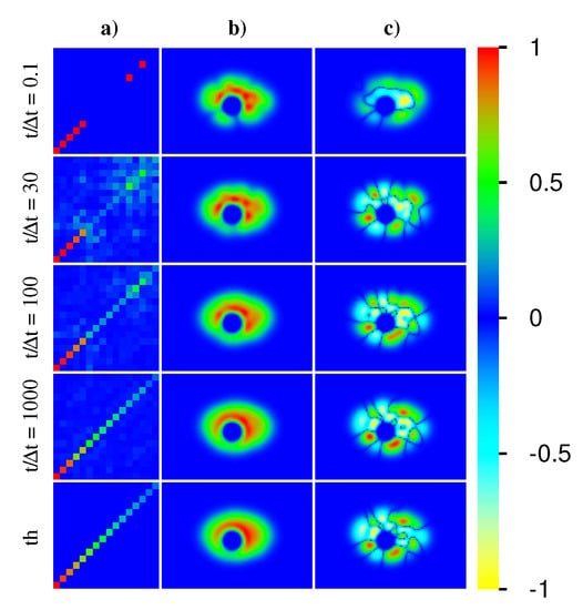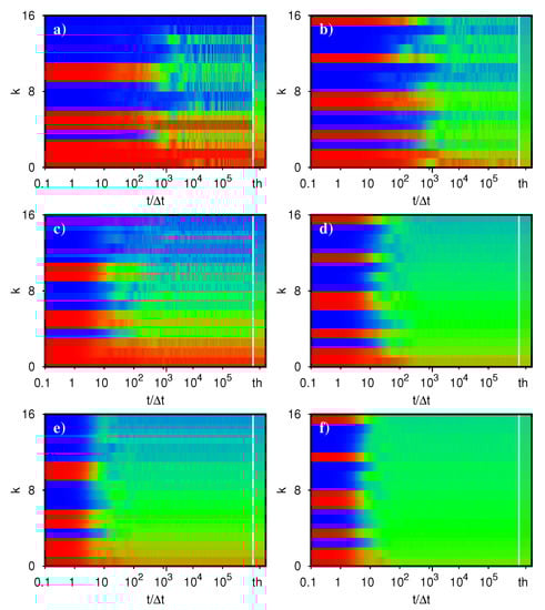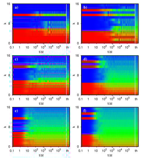 Figure 7. Color density plot of the orbital occupation number n k in the plane of orbital index k and time t for the time dependent state | ψ ( t ) > = exp ( i H t ) | ψ ( 0 ) > with initial condition | ψ ( 0 ) > = | ϕ 1 > = | 0000100000111111 > . The time values are integer multiples of the elementary quantum time step Δ t = t H / d = 1 / [ 2 π σ ( A ) ] where t H is the Heisenberg time (at the given value of A). The bar behind the vertical white line with the label “th” shows the theoretical thermalized Fermi–Dirac occupation numbers n ( ε k ) where β and μ are determined from (12) using the energy E = E 1 p of the state | ψ ( t ) > at the last time value t = 2000 Δ t . The two panels correspond to the Åberg parameter A = 1 (a), A = 3.5 (b). For the translation of colors to n k values, the color bar of Figure 6 applies.