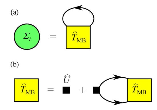 Note that the particle-particle propagator matrix is diagonal because in the Hamiltonian (1), the two bands are coupled only by the Josephson interaction associated with the transfer of a pair from one band to the other one (as is usually assumed, following []). Off-diagonal terms would appear only in the presence of cross–pairing interaction directly coupling fermions belonging to different bands. The self-energy (4), which is obtained by applying standard Feynman rules for the perturbative expansion of the single particle Green’s function, sums up an infinite series of ladder diagrams describing the interaction of a fermion in a given band with a fluctuating pair. Mathematically, the fluctuating pair interacting with fermions belonging to the band i is described by the matrix element of the many body T matrix. Physically, it corresponds to a pair that starts and ends in a given band after having been transferred back and forth from and to the other band (as can be seen by expanding Equation (1) in powers of ).