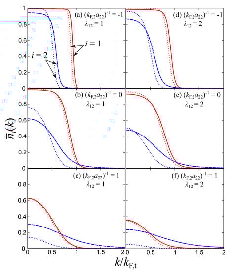 Momentum distribution functions at the superfluid critical temperature identified by Equation (15). The left column corresponds to and (a) , (b) , and (c) , while the right column corresponds to and (d) , (e) , and (f) . The coupling in the deep band is fixed at . The dotted curves correspond to the free Fermi distribution functions calculated with the same chemical potential and temperature.