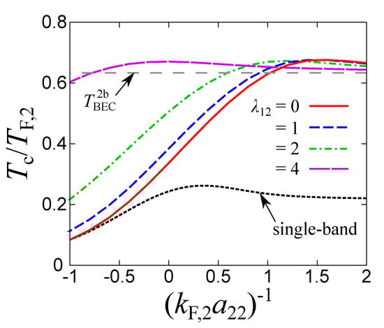 Notice furthermore that, as one can evinces from Figure 7a, in the strong coupling limit, the T matrix approach reaches the BEC value for more slowly than the NSR approach. In the single band case, one can show indeed that for the T matrix approach, the BEC value for is reached in the strong coupling limit according to the asymptotic law []: