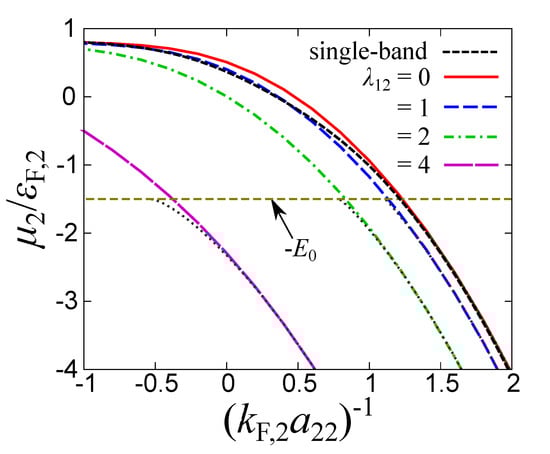 - Iskin, M.; Sá de Melo, C.A.R. Two-band superfluidity from the BCS to the BEC limit. Phys. Rev. B 2006, 74, 144517. [Google Scholar] [CrossRef]