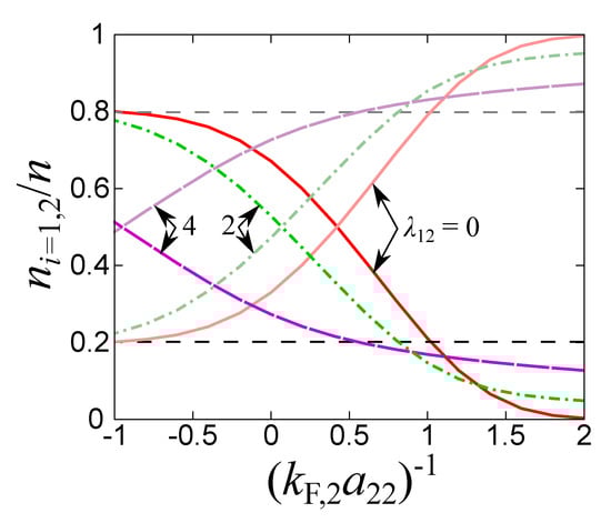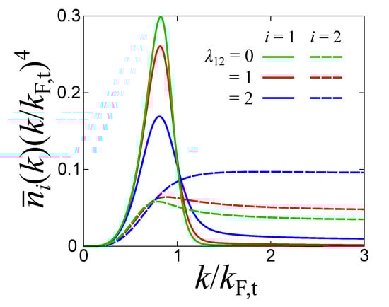 where is an annihilation operator of a fermion with momentum and spin in the i band (). is the kinetic energy measured from the chemical potential . We assume parabolic band structures with a common effective mass in the momentum space as where is the energy separation between the two bands. The second term in Equation (1) is the interaction term with coupling constants and the pair annihilation operator in the i band with center of mass momentum . is a momentum cutoff, taken to be where is the Fermi momentum of the total system with the total number density n. The intraband couplings can be characterized in terms of the intraband scattering lengths as: