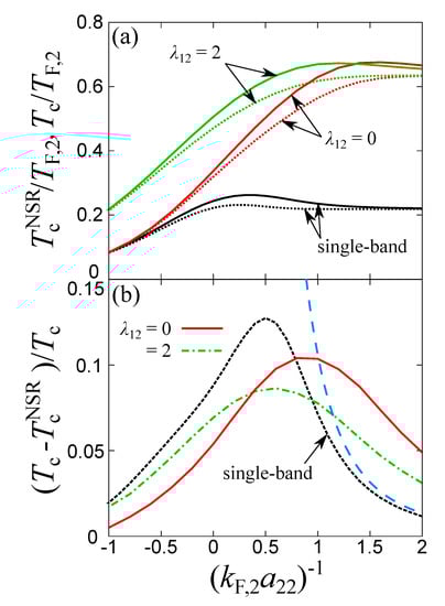 where all quantities refer to a single band, for which . A similar power law behavior is expected in the two band case, with a coefficient depending on . For the NSR approximation, on the other hand, one can easily show that the correction to vanishes exponentially in the strong coupling limit (for both the single band and two band cases). For the single band case, Equation (20) shows indeed good agreement with in the strong coupling regime (see the dashed line in Figure 7b).