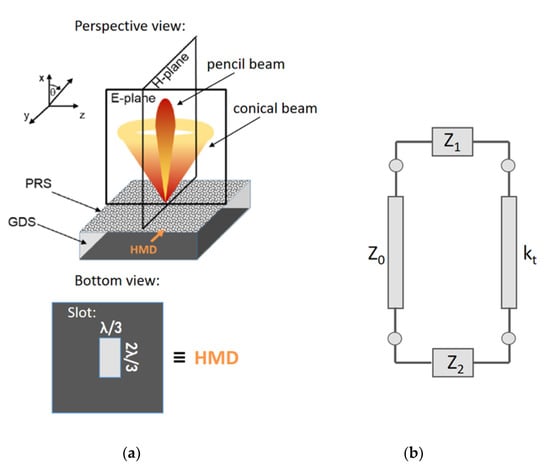(a) an example of FPC-LWA fed by an HMD (horizontal magnetic dipole) oriented along the y-axis [15]; (b) terminated equivalent network representing a waveguide cross-section [13]. An FPC-LWA is constituted by a dielectric substrate with a metallization (i.e., a mirror) on the bottom (grounded dielectric slab, GDS) and a PRS (partially reflective surface) on top. A slot for antenna excitation is etched on the metalized side of the substrate. Note that a back-illuminated quasi-resonant slot can be modeled as an equivalent horizontal magnetic dipole (HMD).