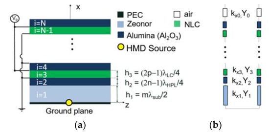 (a) cross-section and (b) equivalent network of a multilayer FPC-LWA with nematic LC cells (NLC) [42].