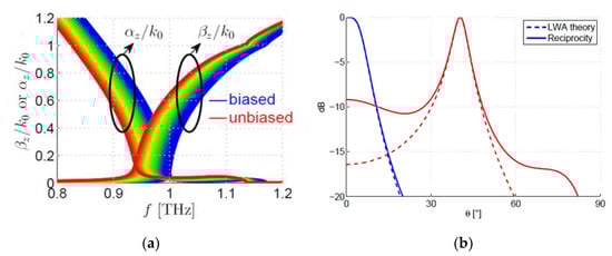 We can consider a multilayer FPC-LWA layout working at f0 = 1 THz, as a case of study able to underline the excellent reconfigurable properties of the proposed structure [42]. The number of layers that constitutes the stack is fixed at 5, i.e., three alumina layers of thickness equal to 75 µm and two LC cells 100 µm thick. Dispersion curves computed between 0.8 and 1.2 THz by means of leaky-wave theory [55,56] are presented in Figure 3a. They are a family of curves obtained gradually changing the voltage between zero (red curve) and the threshold voltage V∞ > VF (blue curve). From a numerical viewpoint, the voltage changing corresponds to a dielectric permittivity commutation as reported in Equation (12), where , , , , , and . Intermediate results can be obtained for intermediate values of voltage, i.e., intermediate values of dielectric permittivity in the x- and z-directions. For the proposed LC cell thickness, values below 20 V are sufficient to cover almost the complete switching range, as can be derived from LC dynamic complex numerical models that take into account molecules’ orientation states at intermediate voltage values [57]. For simplifying the analysis, it is assumed that LC relative permittivity linearly varies with the applied voltage. For this reason, the unbiased and biased states are always correctly predicted. Conversely, the dynamic variation of and , corresponding to voltage values between 0 and 20 V, could change if the permittivity tensor is computed for the intermediate biasing states.