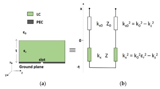 where . The assumption of uniaxial LC is important in the design of an FPC-LWA because it allows for modeling the antenna by means of a simple TEN. In the following, we will consider only the two limiting cases V = 0 and V > VF, while the value of the permittivity in the LC layer is considered as a medium value in the selected direction (i.e., it takes into account the local variations due to the anchoring effect).