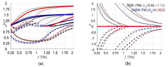 (a) normalized phase constant and (b) normalized attenuation constant spectra of the TM modes of a GDS (black and gray lines) and a GADS (red and blue lines) obtained by changing the values in the LC permittivity tensor. Proper modes are depicted in solid lines, physical and nonphysical improper complex modes are represented in dotted and dashed lines, respectively [59].