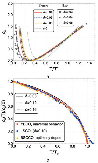 42] is valid. Both the requirements are satisfied, for example, in the case of in-plane resistivity and superfluid density in the PG “phase”. In fact, the theoretically derived universality curves are in a quite satisfactory also quantitative agreement with the corresponding experimental data, as shown in