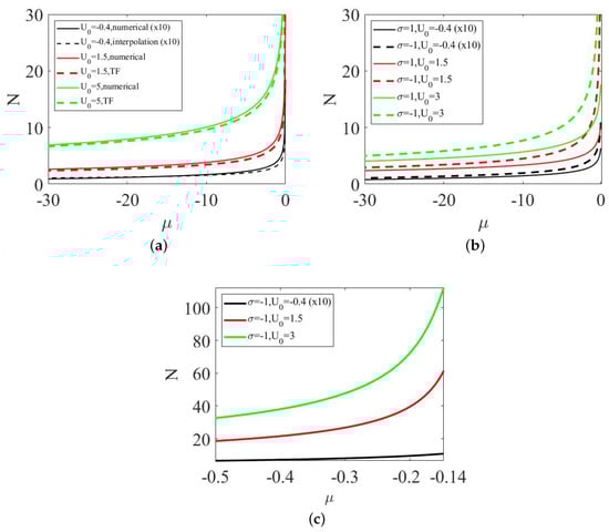 Dependencies for stable GS solutions with , and for , , , which correspond, respectively, to the repulsive and attractive central potential (in the former case, N is multiplied by 10, as the actual values of the norm are too small in this case). Panels (a) and (b) correspond to the system which does not or does include the repulsive or attractive cubic term ( and , respectively). In (a), the numerical results are juxtaposed with the TF counterparts produced by Equation (39) (except for , when the TF approximation is irrelevant; however, in this case the interpolating approximation, based on Equation (37), is very close to the numerically generated curve). In (b), the numerical curves are compared for and . Panel (c) is a zoomed-in view of the plot from (b) at small values of , with the aim of showing relative proximity to the threshold value for , as predicted in the TF approximation by Equation (43) (this point is discussed in detail in the text).