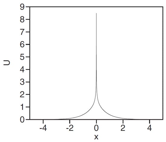 At , these 1D solutions are subject to instability against the wave collapse; i.e., catastrophic shrinkage of the self-focusing field []. In the case of (self-defocusing), Equation (10) gives rise to an exact solution in the form of a singular soliton: