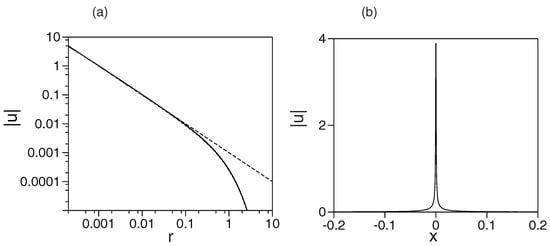 In the 3D setting, the numerical solution of Equation (71) produces a family of 3D singular solitons. A comparison of these solutions with the analytical prediction, given by Equations (73) and (76) for small r, is not straightforward, as the analytical expression contains indefinite parameter . Therefore, an example, displayed in Figure 7a, presents the comparison of the numerical solution to analytical profile at small r, with the constant selected as the best-fit parameter ( for the case of , displayed in Figure 7a).