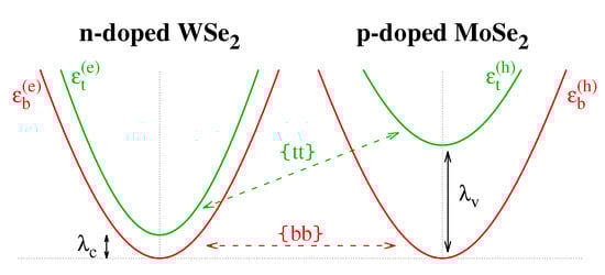 Because of the large band gaps, we need only to consider conduction band processes [,] (see Figure 1). For each of the monolayers, we label the bottom and top conduction subbands  and . Due to the large valley separation in momentum space, inter-valley scattering is negligible, so the effect of the two valleys appears only in a valley degeneracy factor, .