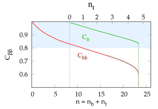 Equation (8) has the same form as for a decoupled one-band system, because the two bottom bands are aligned []. In contrast, Equation (9) contains the effect of misalignment of the top bands through the term . This term drops below unity only at higher densities where the pair coupling strength is weak compared with the misalignment.