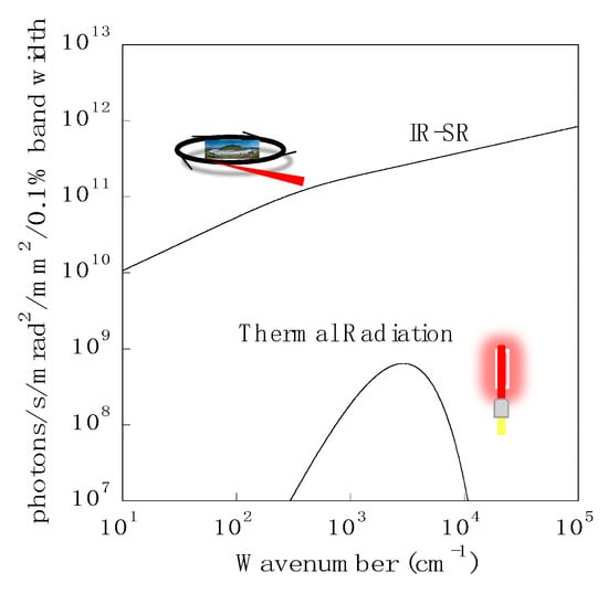 One of the most commonly used IR broad-band light sources for spectroscopy is a thermal radiation source, such as a globar lamp. IR-SR is another broad-band source for spectroscopy, with a high-brilliance feature. Figure 1 shows the brilliance of IR-SR estimated using BL43IR parameters, and that of the thermal radiation calculated using Planck’s formula at 1500 °C. The definition of brilliance is the number of photons emitted from electrons in a storage ring per second, per angular divergence of the photons, per cross-sectional area of the beam and per bandwidth of 0.1% of the central photon energy. In Figure 1, the brilliance of IR-SR is shown to be more than two orders higher than that of the thermal radiation in the whole spectral range, from near-IR to THz waves [10]. Various kinds of IR sources, other than IR-SR and the thermal radiation source, have been developed recently. The IR free electron laser is one of the high-power sources, and it is often used as an excitation source [11]. Recently, broad-band IR lasers have become popular, such as quantum cascade lasers and IR fiber lasers. They have strong power, and the bandwidth is large enough to be used as sources of spectroscopy [12]. The spectral range, however, is still limited in the mid-IR region. The lowest wavenumber is about 1000 cm−1. In the THz region, time-domain spectroscopy (TDS) is often used. The highest wavenumber of TDS is about 200 cm−1, and there is a gap between the broad-band IR laser. The IR-SR is an important source that covers the gap and also has a high-brilliance feature.