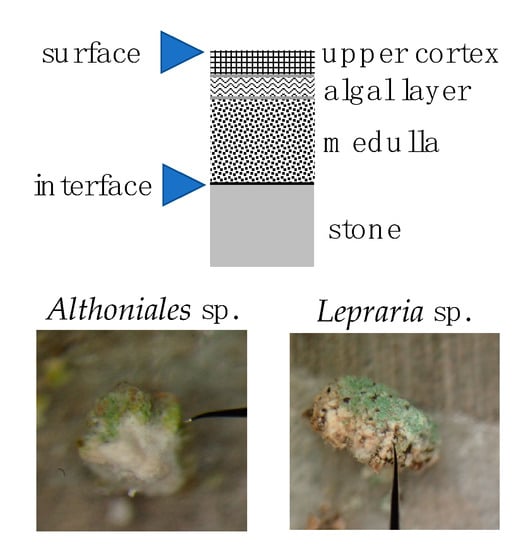 Schematic illustration of the structure of lichen on stone (top). Microscope photographs of Althoniales sp. and Lepraria sp. (bottom).