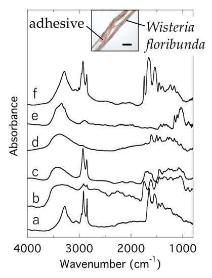 From Figure 5, the absorption spectra of the adhesives are seen to be different depending on the position. This means that the adhesives are composed of multiple substances. Some of the absorption peaks in Figure 5 can be assigned as follows. The peak at about 3300–3400 cm−1 corresponds to OH, double bands at 2926 and 2847 cm−1 correspond to CH3 and CH2 symmetric stretching modes, and the bands at 1660 and 1546 cm−1 correspond to amide I and II. For the assignments of other absorption bands, composition analysis may be useful. The lower wavenumber region experiments are also expected to yield information because the main components, such as protein and textile fibers, sometimes have peaks in that region [21]. The overall shape of spectrum a is similar to curve f of soy bean, and curve b is similar to the lacquer curve c, although there are some differences. Comparing spectra b and c, we see that the double band at about 2800 cm−1 is small in c and broad in b. The band at 2600 cm−1 in c splits in b. Spectra a and f are similar, but the band at 1740 cm−1 in f is not present in a. One possible reason for the differences may be the deterioration of samples a and b.