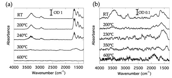 Dr. Tomohiro Higuchi conducted a study to analyze organic residuals in the overglaze layer of Japanese ceramics. When a Japanese ceramic is painted with overglaze, some kind of glue is used before it is fired at a high temperature [22]. After firing, a small amount of organic materials has been found to remain in the overglaze layer. The residual is thought to originate from the glue [23]. It is also predicted that the organic materials form compounds with metallic elements included in glass frit. These remains are expected to be observed in mid-IR and the low-wavenumber region. The final purpose of this study is to identify the glue from the residual organic materials observed in the fired ceramics. Information about the kind of glue is expected to provide knowledge about the place where the ceramic vessels were made. In this study, simulated samples were prepared, to observe the change in the state of the glue during the firing process. Two kinds of commonly used glue, nikawa (Kissho, granular animal glue) and funori (Isekyu, red seaweed glue) were used. They were dissolved in water at 10% m/m and 2% m/m, in mass concentration, and 1 mL of solution was mixed with 1 g of colored overglaze that contains Pb-included frits and iron oxides. The mixed colored overglaze was applied to a CaF2 substrate. Absorption spectra of the sample were measured during heating to 600 °C, on a temperature-controlled stage (LINKAM 10036L). The heating rate was 100 °C/h, and the atmosphere was air. The wavenumber resolution was 4 cm−1, and the number of scans was 64. Figure 6a,b shows the absorption spectra of the nikawa- and funori-containing samples, respectively. The observed temperatures were room temperature, 200, 240, 300 and 600 °C in Figure 6a; and room temperature, 200, 230, 350 and 600 °C in Figure 6b. The optical densities (OD) are shown in the figures by the bars. The ODs are different between Figure 6a,b because the sample thicknesses where the spectra were measured were different. At a high temperature, such as 600 °C, the thermal radiation from the sample reaches the detector and increases the background noise. The spectrum at 600 °C in Figure 6b was measured under such conditions.