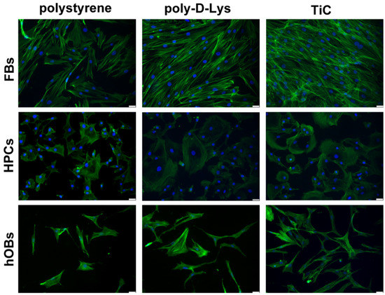 Organization in fibroblasts (FBs), chondrocytes (HPCs) and osteoblasts (hOBs) seeded on polystyrene, poly-d-Lysine-coated glass (poly-d-Lys) and titanium-carbide-coated glass (TiC). Cells were seeded, and after 48 h, they were analyzed by Immunofluorescence by using Phalloidin Alexa Fluor 488. Nuclei were stained with DAPI (original magnification 20×, scale bar = 50 μm).