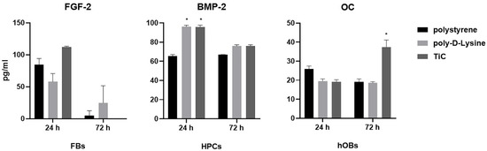 To verify whether the substrate chemistry stimulated the cells to produce factors involved in their metabolism, the amount of FGF-2, BMP-2 and OC was measured in the cell culture medium of FBs, HPCs and hOBs, respectively (Figure 2). FBs cultured on TiC for 24 h produced a higher amount of FGF compared to FBs cultured on polystyrene and poly-d-Lys, even if the increase was not statistically significant. After 72 h, the amount of FGF-2 was undetectable in the medium of the cells cultured on polystyrene and TiC, while the cells on poly-d-Lys were still producing FGF-2. Compared to polystyrene, at 24 HPCs produced statistically significant (P ≤ 0.05) higher amounts of BMP-2, both on poly-d-Lys and on TiC. Finally, hOBs produced a statistically significant larger amount of OC when cultured on TiC compared to polystyrene and poly-d-Lys after 72 h culture.