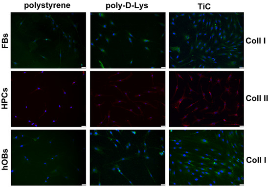 Imagesof collagens in fibroblasts (FBs), chondrocytes (HPCs) and osteoblasts (hOBs) seeded on polystyrene, poly-d-Lysine-coated glass (poly-d-Lys) and titanium-carbide-coated glass (TiC). Cells were seeded, and after seven days, they were analyzed by immunofluorescence, using anti-collagen type I (Coll I) or anti-collagen type II (Coll II) and Alexa Fluor 488 (green) or 576 (red) secondary antibodies. Nuclei were stained with DAPI (original magnification 20×, scale bar = 50 μm).