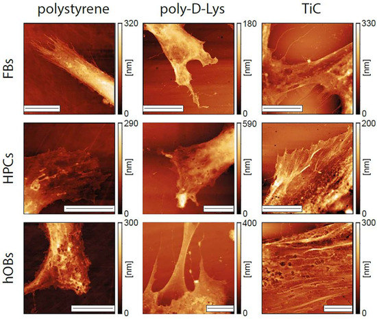 Images of the extremities of fibroblasts (FBs), chondrocytes (HPCs) and osteoblasts (hOBs) seeded on polystyrene, poly-d-Lysine-coated glass (poly-d-Lys) and titanium carbide-coated glass (TiC). Cells were seeded, and after 48 h were immobilized and analyzed by contact-mode AFM. The scale bar represents 10 μm.