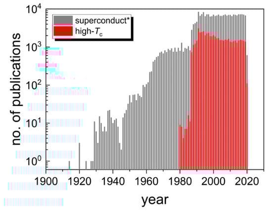 Figure 1 shows that after 1986 about 30% of the publications related to superconductivity covered high-Tc research (see [6,7,8]). Since 1986, the number of publications dealing with superconductivity essentially remains constant at a high level of about 6500 per year, whereas the number of high-Tc papers decreased gradually after a peak in 1991 with approximately 3100 publications and currently levels off at about 1400 publications per year. A closer inspection of Figure 1 also reveals a couple of historically very interesting aspects: After the discovery of superconductivity in mercury by H. Kamerling Onnes in 1911 [9] there was an extended period lasting until the late 1950s with a continuous but moderate increase of the publication output with about 10 to 50 superconductivity publications per year. Note the plunge in the number of publications in the late years of the Second World War. Certainly triggered by the development of the Bardeen-Cooper-Schrieffer (BCS) theory of superconductivity [10] but very likely also by the first placing of a satellite into Earth’s orbit by the Soviet Union in October 1957, the number of publications rose steeply in the late 1950s and early 1960s [11]. This event, perceived in the Western world as the ‘Sputnik crisis’, initiated massive funding increase into science, especially in the USA [12]. As a consequence, the number of scientists working in the field and the publication output increased steeply after 1957 [13,14]. The data also show that after 1970 the publication output stalled and flattened, because no new discoveries were made, and increased dramatically after 1987.