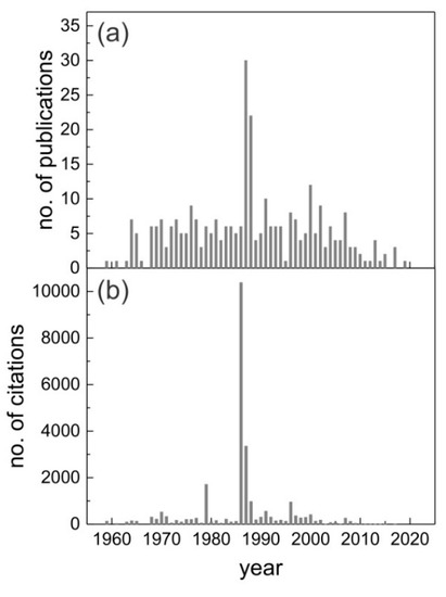 Rarely in the history of physics has a discovery had such a prompt and enduring impact as the observation of high-temperature superconductivity (high-Tc) in the Ba-La-Cu-O system by J. Georg Bednorz and K. Alex Müller in 1986 [1]. The unexpected disclosure of superconductivity at temperatures about twice as high as had been known before [2,3] triggered immediate (sometimes hectic and often very competitive and controversial) research activity targeted at the synthesis of compounds with even higher Tc’s and the still contentious theoretical explanation of high-Tc superconductivity. The bursting reaction in the search for new and deeper insight into already known high-Tc materials is reflected in the instantaneous rise of the number of publications indexed by the Web of Science (WoS) [4,5] before and after 1986 (see Figure 1).