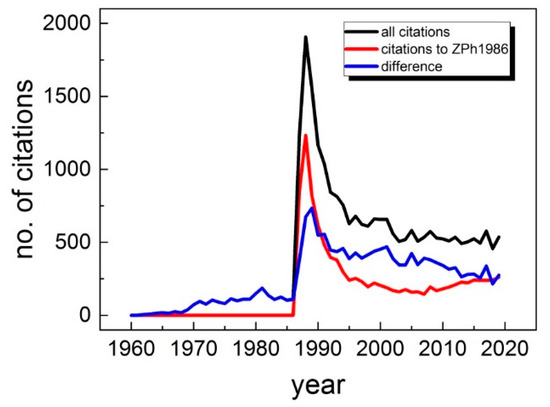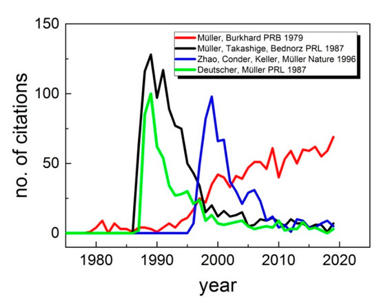 The citation record as a function of time of a particular article, colloquially called its ‘citation history’, is specific for every article. However, it often follows a similar pattern [20]. Typically, it takes about one or two years until the citation count markedly starts to rise. Often, the citation count reaches a peak after about three years with a subsequent decrease when newer research results gradually become available. Such exemplary pattern can be observed for three of the four next highest cited publications of Müller, namely those in collaboration with Müller, Takashige, Bednorz, PRL 1987, Zhao, Conder, Keller, Müller, Nature 1996, and Deutscher and Müller, PRL 1987 (see Figure 4). However, the paper by Müller and Burkhard, Physical Review B (PRB) 1979 [21] (about 1200 total citations) entitled ‘SrTiO3—Intrinsic quantum para-electric below 4 K’ exhibits a remarkably different citation history. Published in 1979, it was barely referenced until about 1990. Afterwards, it picked up and kept on increasing until now. It appears that the research reported in this article was well ahead of its time. Publications showing such delayed recognition have sometimes been labeled as ‘sleeping beauties’.