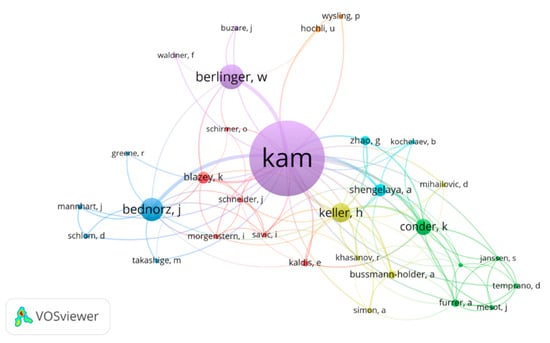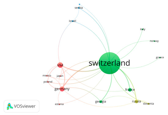 Not surprisingly, K. Alex Müller’s main co-authors were affiliated with research institutions in his home country Switzerland (see Figure 6, also generated using the software VOSviewer [22]), which are by far dominating the co-authorship network. Outside Switzerland, the co-author network comprised colleagues from 16 countries (one disconnected country, The Netherlands, was removed). The immediate neighbors, France and Germany (note that Germany includes Western Germany before the reunification), rank second followed by the USA. However, there are also substantial numbers of co-authors from Russia (note that Russia includes the Soviet Union) and smaller countries like Georgia, Slovenia, and Estonia