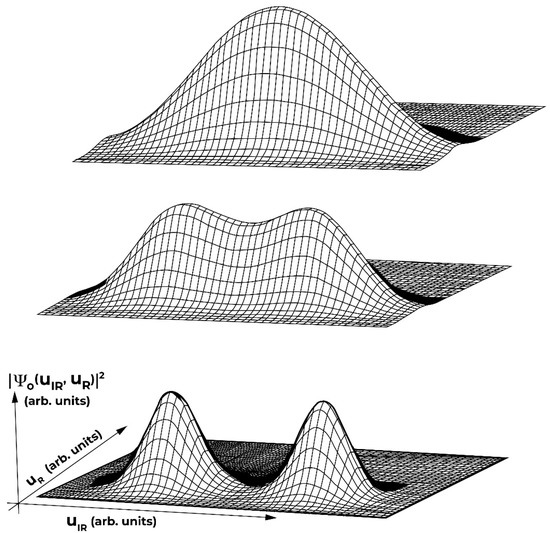 Squared many-body ground-state wave function of an O–Cu–O cluster as a function of the Raman and infrared coordinates for three IR coupling strengths (weak, intermediate, strong). When the phonon coordinate is at the left bump, the extra hole is predominately on the leftmost oxygen, and vice versa. The scale of the coordinates is fixed to be 3 times the root-mean-square fluctuation of the quantum wave function, and therefore it is different for the three panels (see [18]).
