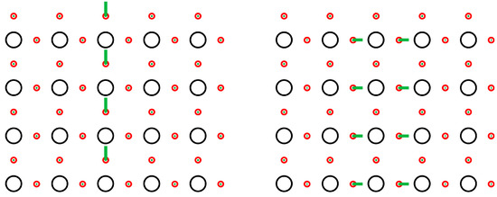 We can study the lattice, spin, charge fluctuations around these polarons, and multi-polaron patterns within a real-space random field approximation (RPA) [25,26]. Since the polarons are small and the stripe interfaces sharp, the stripes are topologically “protected” and the fluctuations include ones that are spatially localized around the polarons or stripes and thus substantially separated in frequency from the band of k-space modes in the broken-symmetry host: i.e., symmetry-determined transverse and longitudinal “edge mode” vibrations of spin, charge, and lattice [25]. As illustrated in Figure 3, they are all dominated by O ion motion, resulting in Cu–O bond length fluctuations coupled to charge and spin fluctuations. Of course, any slow diffusion of polarons or stripes introduces a cut-off or broadening for the local mode frequencies, and any stripe curvature introduces a wave-vector cut-off.