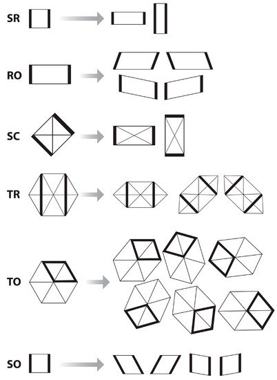 Symmetry-allowed transitions in 2D for four crystal systems. (See Ref. [35]). The dark lines are visual guides to indicate deformations. There is a one-component strain order parameter (OP) for the square-to-rectangle (SR) case, driven by deviatoric strain, : the rectangle-to-oblique (RO) case, driven by ; and the square-to-centered rectangle (SC) case, driven by shear strain, . A two-component OP, or two one-component OPs, leads to the triangular-to-centered rectangle (TR) case, driven by , ; the triangle-to-oblique (TO) case, driven by , ; and the square-to-oblique (SO) case, driven by and independently. Copyright 2020 American Physical Society.