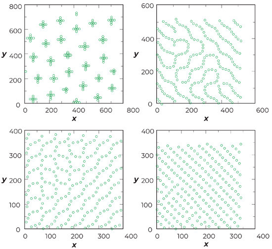 Simulated static positions of holes for different densities, n, in model Equation (2): (a) clump phase, n = 0.6; (b) soft phase, density n = 1.2; (c) soft phase, n = 2.1; and (d) anisotropic Wigner crystal phase, n = 2.7. Copyright 2020 American Physical Society.