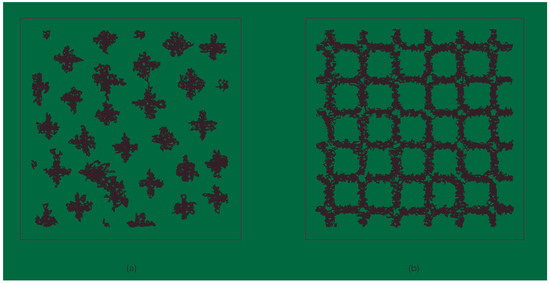 I conclude this section with a more general perspective on multiscale landscapes resulting from coexisting short–long-range interactions. In particular, the appearance of glassy filamentary phases in windows of intermediate doping concentration (“intermediate phases”) [62,63] is demonstrated in [64,65] as a model of doped 2D anti-ferromagnets. I believe these intermediate phases are very important functionally and should be realized in many materials, including doped TMOs. For example, using efficient numerical methods to handle long-range interactions, references [65,66] study a quasi-classical model for the charge ordering of holes in TMOs, in which the particles have a Coulomb repulsion and a dipolar attraction. As a function of hole density (doping), an extended soft phase comprising partially ordered filaments is found (see Figure 9). Ordered clumps form for low densities and ordered stripes (Wigner crystal-like phases) at high densities (see Figure 10). The soft filamentary structures persist to high temperatures. Within the soft phase region, there is an onset at low T of motion along the filaments: i.e., the filaments act as a template for the correlated percolation of particle motion. When the particle positions are averaged over long times, the filaments form a checkerboard pattern (see Figure 11). All of this rich multiscale patterning and dynamics arises from a deceptively simple 2D model in which the effective interaction between two holes, 1 and 2, a distance r apart is given by