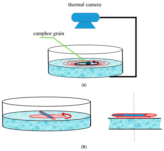 The experimental system is shown schematically in Figure 1a,b. Generally self-propulsion of the camphor-driven objects is possible under two scenarios, namely under evaporation and dissolution of camphor [19,20,21,25]. Both of the regimes were studied experimentally. When the self-propulsion was guided by dissolution of camphor, the grains were placed directly on the water surfaces, as shown in Figure 1a. A special rotator, depicted in Figure 1b, was designed for the study of the evaporation-guided self-propulsion. Camphor was placed in the polymer tubing, with a diameter of 1 mm.