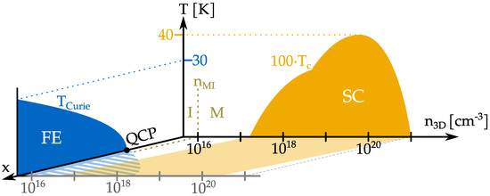 - Collignon, C.; Lin, X.; Rischau, C.W.; Fauqué, B.; Behnia, K. Metallicity and Superconductivity in Doped Strontium Titanate. Ann. Rev. Condens. Matter Phys. 2019, 10, 25–44. [Google Scholar] [CrossRef]