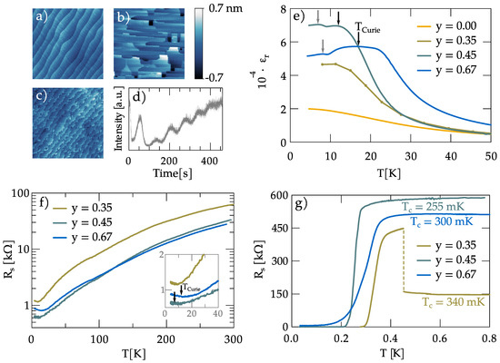 Figure 2f,g shows the sheet resistance (R) as a function of temperature. Between 300 and 1.5 K, the behavior of these samples is similar to that of standard LaAlO/SrTiO heterostructures [63]. The resistance has a slight dip at ∼95 K, which is presumably due to the antiferrodistortive transition at 105 K [64,65,66]. For all investigated samples, the resistance shows a small upturn below ∼15 K, the origin of which is still under investigation. It should be noted that an anomaly/upturn has been observed in the low-temperature resistivity of bulk Ca-substituted SrTiO samples and was associated to a ferroelectric-like state still existing in metallic samples [46,67]. Similarly, a study performed on heterostructures of LaAlO grown on top of Ca-substituted SrTiO substrates showed the presence of a resistance upturn occurring just below the Curie temperature, possibly linked to the ferroelectricity of the substrate [68]. If the temperature is further decreased, the samples undergo a superconducting transition at = 340, 255, and 300 mK for y = 35, 45, and 67%, respectively. is defined as the temperature at which the resistance is 50% of its value in the normal state (here at 800 mK). The transition temperature observed for the three samples is similar to that reported in the 2D electron system confined in standard SrTiO substrates [11,60]. We note that a comparison between the phase diagram shown in Figure 1 and our data for the LaAlO/ST(OO) interfaces is difficult due to the uncertainty on the equivalent 3D carrier density of the 2DES, which has an exponential charge profile inside the substrate. This pilot study shows that the presence of a ferroelectric SrTiO substrate is compatible with the formation of a conducting—and even superconducting—system at the interface with LaAlO, and opens the path to the exploration of its effect on the electronic properties.