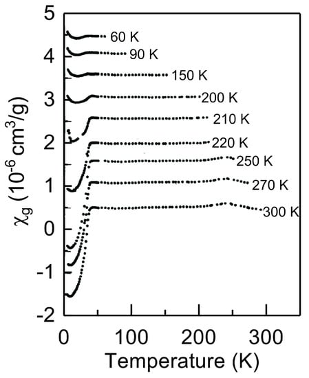 Figure 1. Gram-susceptibility of an ’as-prepared’ La 2 CuO 4 + δ ( δ 0.01) sample as a function of temperature. The sample was rapidly quenched from room temperature to the indicated temperatures and subsequently the magnetization ( B ext 9 mT) was collected by slowly cooling the sample. Beginning from the lowest data set each curve was shifted upwards by a value of 5 × 10 7 cm 3 /g compared to the preceding one. (Adapted from Figure 1a, Ref. [5,6] by permission from Springer/Nature/Palgrave).