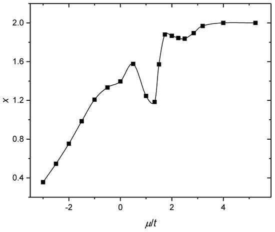 Figure 4. The dependence x ( μ ) in the Hubbard-Kanamori model with two orbitals. U = 6 t , J = 1.5 t , and T = 0.13 t .