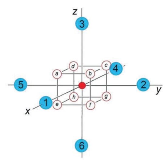 The octahedral fragment of the perovskite crystal structure ABO3 with the transition metal atom B at the center (red) and six oxygen atoms at the apexes of the octahedron (numbered, blue). The letters a, b, c, etc., denote the induced by the PJTE eight equivalent off-center positions of the atom B in the eight wells of the APES (reprinted from [4]).