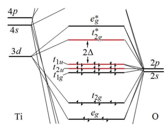 The energy-level correlation diagram (not to scale) for the octahedral cluster [TiO6]. HOMO t1u and t2u (mostly oxygen) and LUMO t2g (mostly titanium) are one-electron energy levels of the orbitals that are mixed in the PJTE. The shown electron population corresponds to the particular case of [TiO6]8− [4,10].