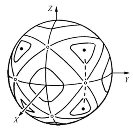 Contour map of the ground-state APES U(Qx,Qy,Qz) for the octahedral cluster [BO6]8− due to the PJTE coupling of its oxygen HOMOs to the central-atom’s LUMOs. Equipotential level curves are projected on the surface of a sphere. Solid dots represent trigonal (rhombohedral) minima, open dots are orthorhombic saddle points. Broken curve is the path of steepest descent from one of the saddle points to the closest wells [6].