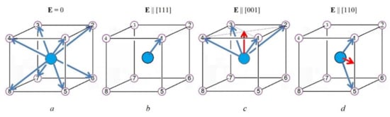 Polar displacements (blue arrows) of the central atom (blue) in the octahedron [BO6]. White circles correspond to off-center equilibrium positions of the central ion B (the blue ball) in eight trigonal wells. (a) At no polar perturbation, the trigonal wells are symmetry-equivalent and therefore equally populated. The ion B has an equal probability to be off-center shifted (blue arrows) to each well and, on average, its off-center shift is zero. (b) Under a trigonal field E ‖ [111], one well is deeper than the others, and at low temperature, it is the only one temperature populated. The vector of average displacement (the blue arrow) is along the field parallel to the axis [111]. (c) In the tetragonal field E ‖ [001], the wells 1, 2, 3, and 4 remain symmetry-equivalent to one another; they are the lowest in energy and hence most populated. The mean displacement (red vector) points are along the axis [001]. (d) With the field E along the second-order axis, E ‖ [110], the wells 1 and 5 are the lowest and the only ones thermally populated. Therefore, the mean displacement (red vector) is along the electric field, E ‖ [110] [6].