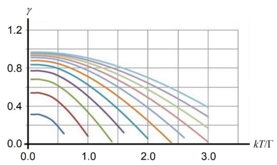 Here, γj = λQ0⟨Qj⟩/(Г√3) and j = x, y, z is the dimensionless mean-field order parameter in terms of the tunneling constant Г. The three order parameters γj are solutions of the following system of coupled transcendental equations, Zγ⟨Qj⟩γ = Tr(e−βHQj) and Zγ = Tr(e−βH) with j = x, y, and z. Here, β = 1/kT, and the index γ means self-consistent dependence on the components γj included in the mean-field Hamiltonian (5). In the lowest-temperature rhombohedral phase, all atoms B are coherently shifted into the same trigonal well, say, in the direction [111]. In this case, γx = γy = γz = γ, and there is just one transcendental equation to solve. The mean-field E deepens the respective trigonal well. If E is strong enough, with the ordering energy p∙E comparable to Г, it quenches the tunneling and locks the system in this well. Rising temperature weakens the mean-field, reducing its locking effect. For different values of the correlation parameter j = p0A/Г, the calculated temperature dependence of the order parameter γ is shown in Figure 5. Plugging the resultant value of γ into the expression for the Helmholtz free energy, with , we find the free energy Φ111 of the rhombohedral phase. Figure 6 shows the temperature dependence of Ф for different ferroelectric phases where we assume j = p0A/Г = 5.