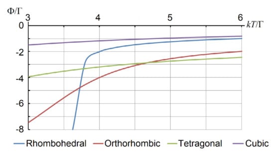 In the orthorhombic phase, all atoms B are off-center shifted along the two-fold symmetry axis [110]. As there is no minimum on the APES in this direction, we treat this “displacement” as resulting from an averaged motion evenly spread over two near-neighbor trigonal wells, the well b and the well f in Figure 1, separated by the orthorhombic potential barrier. In this case, γx = γy = γ and γz = 0, and again we have just one equation to solve. Plugging the evaluated values of γx = γy = γ and γz = 0 into the Helmholtz free energy, we find Φ110 in the orthorhombic phase (Figure 6). Solving the equation Φ111 = Φ110 for temperature, we find TC for the rhombohedral-to-orthorhombic phase transition. At around kT/Γ = 3.8, the graph of Φ111 intersects with that of Φ110. Above TC = 3.8Г/k, the free energy Ф111 of the rhombohedral phase is above the orthorhombic phase Ф110. The latter becomes energy-advantageous, and therefore, at TC = 3.8Г/k, the rhombohedral-to-orthorhombic phase transition takes place. In this model, its dependence on the inter-cell coupling parameter A is close to linear, kTC ≈ 0.8p0A − 0.3Г [6].