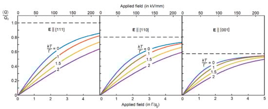 Approximate values of ⟨Q⟩/Q0 versus the applied electric field E (in Г/p0) resulting from the tunneling Hamiltonian at three different directions of the applied electric field, (a) E ‖ [111], (b) E ‖ [110], and (b) E ‖ [001], and at four different temperatures, kT = 0, Г, 1.5Г, and 2Г. The broken lines are horizontal asymptotes when E → ∞. Shown above is the scale corresponding to the case of barium titanate with Г = 35 cm−1 [53].