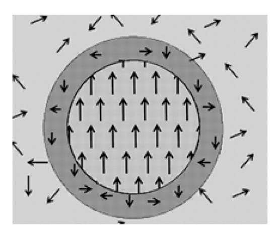 Polarized nanoregion inside the cubic perovskite with spherical form (center) and a border layer (dark) at temperatures T above the Curie one TC, but below the Burns temperature TB, ТС < Т < ТВ. Arrows indicate the direction of the local averaged dipole moments, which are tetragonally ordered inside the PNR and fully disordered in the cubic phase. For the role of the PNR surface layer, see the text (reproduced with permission from [7]. Copyright 2018, American Physical Society).